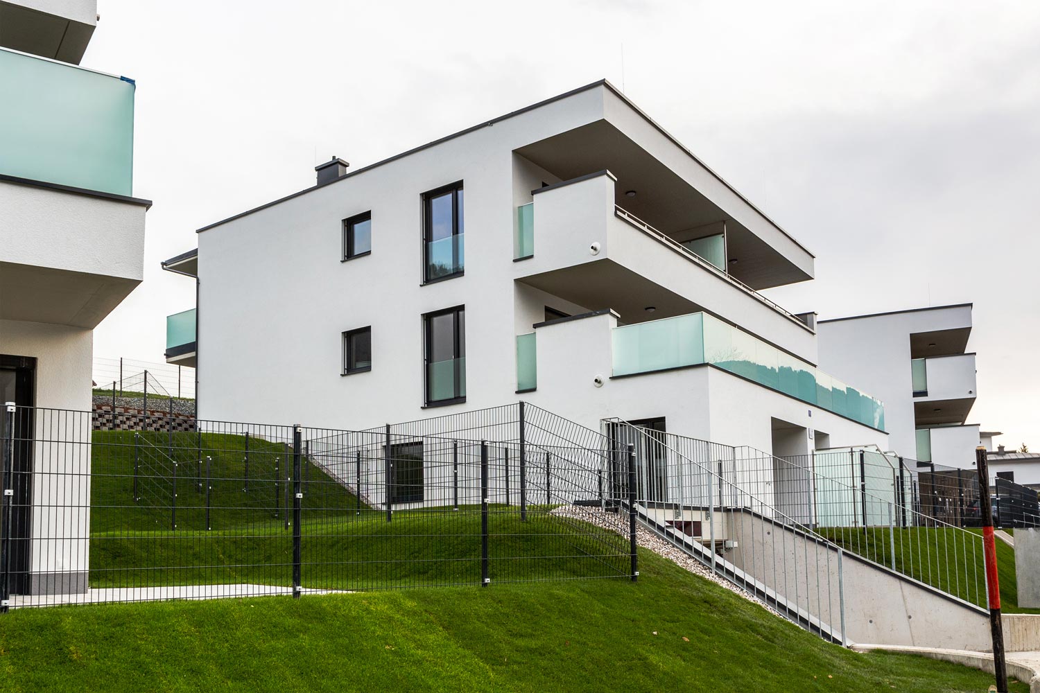 Die Mehrfamilienwohnhäuser erstrecken sich auf 3 Geschosse, welche barrierefrei errichtet wurden und sind sämtliche Etagen mit einem Personenaufzug von der obersten Etage bis in die Tiefgarage mühelos erreichbar. Die 2- und 3- Zimmerwohnungen weisen eine Größe von 58 – 75 m² Wohnnutzfläche auf und wurden durch die stufenförmig luftig angelegte Architektur mit idyllischen Gärten, ansehnlichen Loggien oder beeindruckenden Terrassen gestaltet.