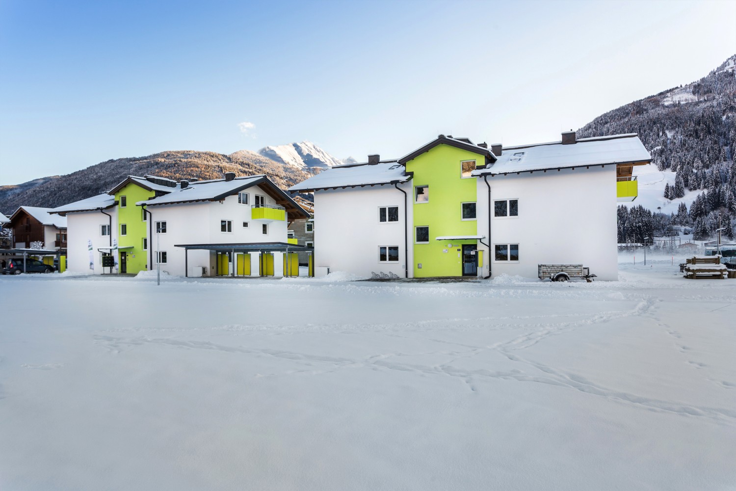 Die zwei Gebäude mit je 9 Wohneinheiten erstrecken sich auf drei Geschosse. Jeder Wohnung ist ein Carportplatz zugeordnet und trotz der gegebenen Kleingliedrigkeit sind sämtliche Etagen mit einem Personenaufzug mühelos erreichbar. Die 2- und 3-Zimmer-Wohnungen weisen eine Größe von 55-70 m² Wohnnutzfläche auf, verfügen über eine Fußbodenheizung sowie Terrasse oder Balkon.